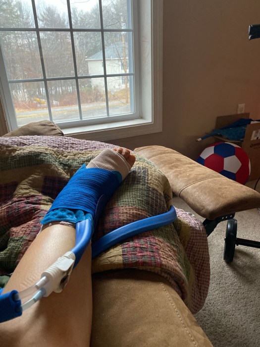 We have found the Breg machine to help a lot. It delivers a steady stream of icy water over my ankle. It runs on ice and water and electricity. I use it daily. I was blessed to have one of my husband’s friends drop it off for us to use.